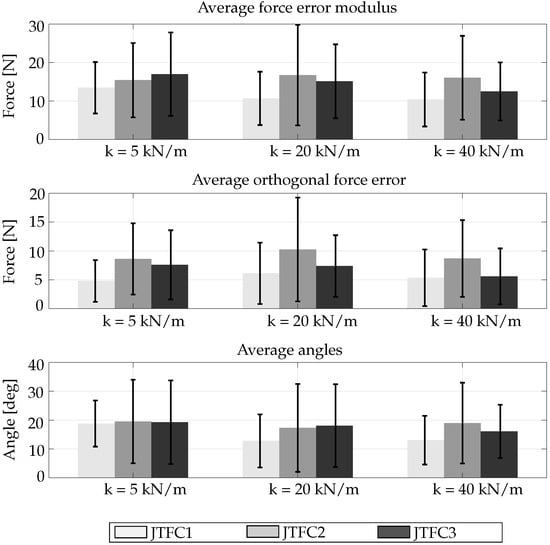 The results are shown in Figure 17. The first graph shows the average difference between the forces rendered by the controllers and the desired forces with an aggregate index, i.e., the norm of the error vector. From this graph, the reader can see that, in all the conditions, the JTFC1 control performs better then the others; in fact, the mean of the error is around 10 N in all three cases.
