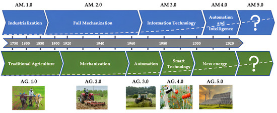 The concept of agricultural automation aligns with the broader context of industrial revolutions. Industry 4.0, the term coined for the fourth industrial revolution, signifies the latest wave of technological advancements. Similarly, the evolution of agriculture has progressed gradually over time, and its milestones can be correlated with the different industrial revolutions [9,10,11,12,20] (Figure 2).