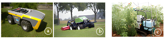 Land preparation robots: (a) Cäsar robot [40] (b) Greenbot robot [40] (c) Spraying robot [42].