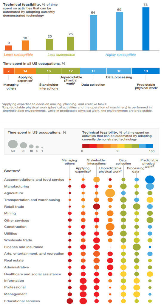 A comprehensive study, which analyzed over 2000 tasks across more than 800 professions, provides valuable insights into this trend. Drawing on data from the US Bureau of Labor Statistics and O*Net, this research revealed that current technologies have the potential to automate about 45% of tasks for which individuals are compensated. Moreover, approximately 60% of all professions could see the automation of at least 30% of their tasks by leveraging existing technological advancements. It is crucial to recognize that the potential for task automation does not automatically imply its adoption (Figure 7).