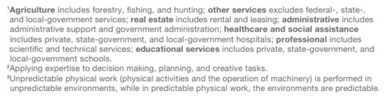 In this examination of automation, the likelihood that specific tasks can be executed by machines using the presently available technologies is assessed. Essentially, it is determining the technical feasibility of automating these tasks. Every profession encompasses a variety of tasks, each with its own distinct potential for automation, Figure 7 delineates the seven primary categories of tasks analyzed. Given that each activity possesses a unique automation potential, an aggregate estimate for the sector is derived by evaluating the duration workers allocate to each activity throughout their work week [61].