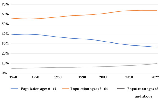 These categories are often referred to as “population age cohorts”. The distribution of the population across these age cohorts has important implications for various sectors, especially for industries. The proportion of the global population in the 0–14 age group has been gradually decreasing in many regions, resulting in a decline known as the “youth dependency ratio”. Moreover, the working-age population, ages 15–64, has historically been a driving force behind labor participation across sectors, including agriculture, serving as the main column of industrial labor. Additionally, due to improved healthcare and increased life expectancy, the proportion of elderly individuals (65 and above) within the global population has been steadily increasing [2,3,4].