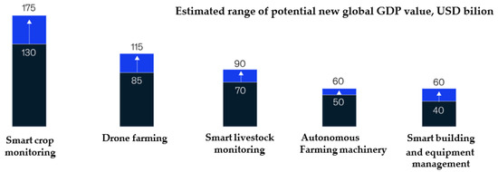 - Goedde, L.; Katz, J.; Ménard, A.; Revellat, J. Agriculture’s Connected Future: How Technology can Yield New Growth. 2020. Available online: https://www.mckinsey.com/industries/agriculture/our-insights/agricultures-connected-future-how-technology-can-yield-new-growth (accessed on 15 February 2024).