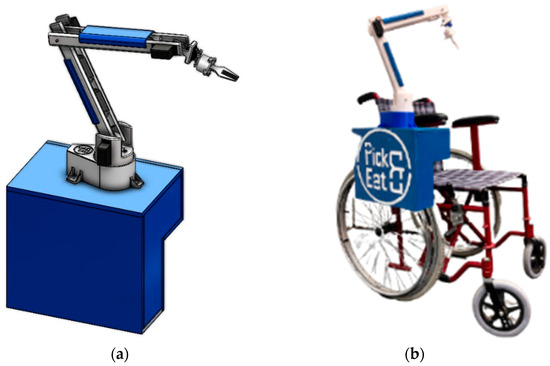 Considering the current absence of a cost-effective, user-friendly, and easily portable solution, this study introduces the mechanical, electrical, and control design of the “Pick&Eat” device as shown in Figure 1. This device is a wheelchair-mounted robotic arm designed to provide autonomous assistance to patients with upper limb paralysis during mealtimes. The proposed design has been meticulously engineered to prioritize flexibility, adaptability, efficiency, and ease of use. The device is designed to seamlessly adapt to wheelchairs of various sizes without causing disturbance or impedance. Additionally, the inclusion of an interchangeable end-effector allows users to select between a fork and a spoon based on individual preferences and needs. The primary objective of this work is to propose an innovative, reliable, cost-effective, and user-friendly device that enhances the quality of life for individuals by promoting functional independence while minimizing assistance costs.