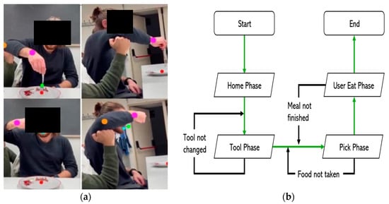 Preliminary analysis conducted: (a) tracking the movement of the task to be performed with frontal view to the left and lateral view to the right (voluntary person in the image is one of the co-authors of this work); (b) logical State Diagram.