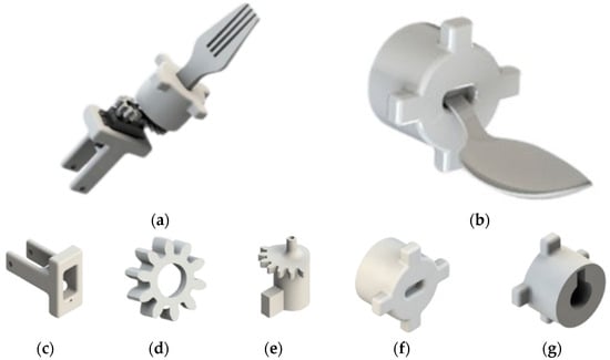 The design of the end-effector of the proposed Pick&Eat device: (a) 3D CAD model of the end-effector with interchangeable module and fork; (b) 3D CAD model of the interchangeable module with spoon; (c) 3D CAD model of the actuating mechanism: detail of the micro servo motor housing; (d) 3D CAD model of the actuating mechanism: detail of the gear wheel; (e) 3D CAD model of the actuating mechanism: detail of the cylindrical pin shaped with a mechanical tab; (f) front view of the 3D CAD model of the interchangeable module; and (g) rear view of the 3D CAD model of the interchangeable module.