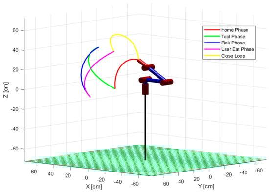 Path planning carried out: in red “Home Phase”, in green “Tool Phase”, in blue “Pick Phase”, in magenta “User Eat Phase” and in yellow “Close Loop” ((note: in the figure hyphen (-) stands for a minus sign (−)).