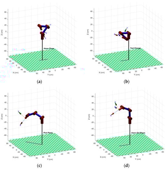 Specifically, the device transitions from the generic position to the resting configuration (Figure 11a), called the “Home Phase”. It then transitions from the Home Phase to the utensil change configuration, “Tool Phase” (Figure 11b), in which the utensils are detached/attached; from the Tool Phase to the “Pick Phase” (Figure 11c), reaching the required pose to pick up food from the dish; and finally, it moves from the dish to the patient’s mouth, called the “User Eat Phase” (Figure 11d).