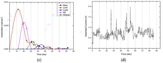 Experimentally measured plots of the position (a), velocity (b), and acceleration (c) of the device and total absorbed electrical current about all servomotors (d).