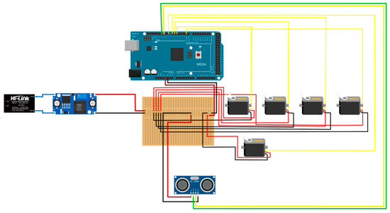 The electrical diagram, presented in Figure 13, is characterized by a transformer, placed inside the frame, to convert AC 220 V to DC 12 V and a step-down converter to lower the voltage to 7.5 V, optimal for the used servomotors. Specifically, two distinct power supply lines were created: the first line at 7.5 V, necessary to power the servomotors, and a second line at 5 V, which powers the micro servo and the ultrasonic sensor.