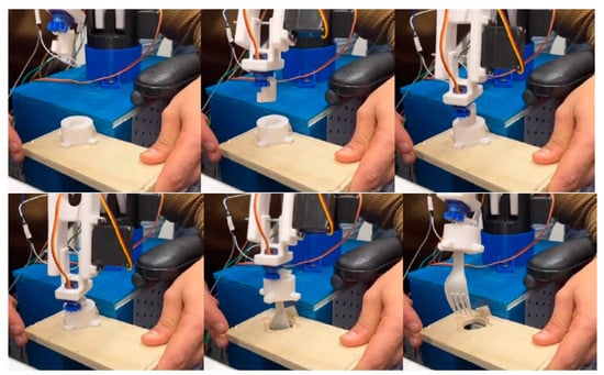 Figure 16. Photographic sequence of the task execution: detail of the correct engagement/disengagement of the interchangeable tool module. - Verification of the correct operation of the entire path studied, verifying the effective taking of the food from the plate and the movement required to bring it to the user’s mouth.