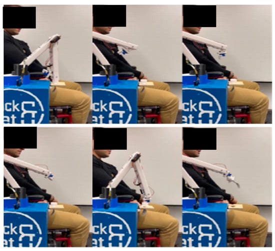 Figure 15. Photo sequence of task execution: detail of correct sensor operation (Voluntary person in the image is one of the co-authors of this work). - Verification of the correct operation of the individual modules, by successively actuating the respective servomotors on the rotation of the device base, the movement of the first link, the second link, and the end-effector.