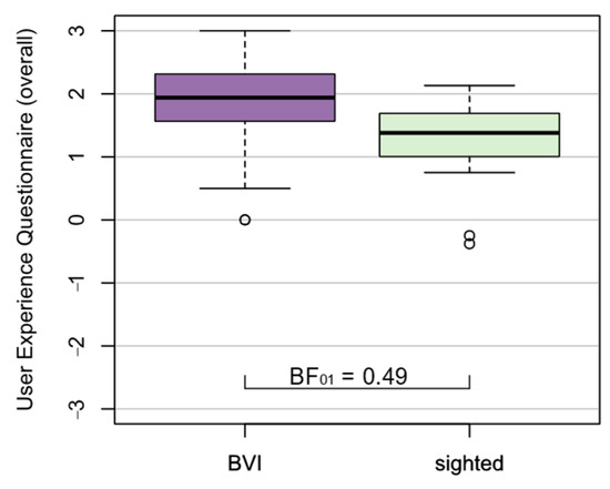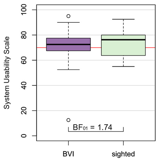 Figure 2 visualizes the results on usability as well as Bayes Factors for comparison of groups (for a description of the Bayes Factor, see Section 2.4). Data showed relatively small variances, but in group ‘BVI’, one outlier is visible. The Bayes Factor was calculated for the groups ‘BVI’ (MBVI = 70.25) and ‘sighted’ (Msighted = 72.50). For the SUS Score, a value of BF01 = 1.74 ± 0% resulted, showing the null hypothesis to be 1.7 times likelier than the alternative. Therefore, data support Hypothesis 1 of equal usability for both user groups. Additionally, means of both groups exceeded the target value of 70, which is acceptable usability according to [34].