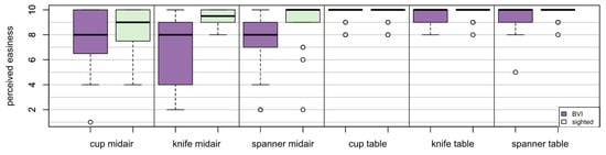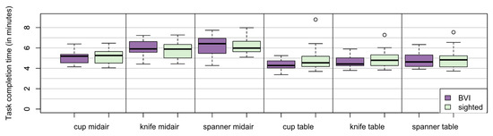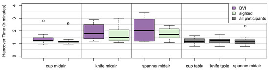 In group ‘BVI’, the success rate varied with object and modality. The lowest success rate occurred during midair handovers of the spanner, still showing a success rate of 89%. For both modalities, handing over the cup was more successful than the spanner and knife.