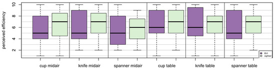 On the one hand, our design followed the recommendation of ISO 9241-11:2018 [32] to combine objective and subjective measures with regard to effectiveness and efficiency. ISO 9241-11:2018 [32] also points out that the results of these measures can correspond with each other, but can also differ from each other. This had to be checked for the measures of effectiveness and efficiency used in this study. For effectiveness, findings of objective and subjective measures corresponded to each other in many respects: high overall effectiveness, but more challenges in the BVI group as well as with the narrow objects knife and spanner. This aligns with relationship analysis, indicating a high relationship between both measures. On the contrary, data are not so clear for the efficiency measures. Here, the objective time-related measures showed a common pattern, namely that the indirect handover on the table was faster, whereas for direct midair handover, the BVI group and the objects knife and spanner showed longer times. This pattern was not reflected in the subjective efficiency ratings, which can be explained by their wide variance. However, the relationship analysis revealed a correlation between task completion time and handover time, respectively, with the subjective ratings of the time required. The longer the objective time measure, the less acceptable it was rated, which could indicate that interaction times have an influence on the perception of efficiency.