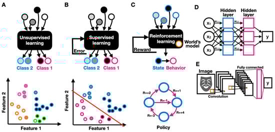 Machine learning models. Schematics of unsupervised (A), supervised (B), and (C) reinforcement learning, describing the models’ inputs, outputs, and feedback; (D) schematic of a deep feed-forward two-layer neural network; (E) schematic of a convolutional neural network with two convolutional layers and one feed-forward fully connected layer.