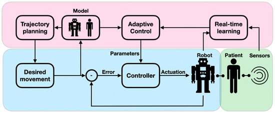 Adaptive admittance controllers: The conventional controller, comprising the desired state, the controller, and the error feedback loop, is shaded in blue; the adaptive feedback component, comprising a model of the robot–patient behavior, a mechanism for real-time learning, and a control module that drives correcting signals, is shaded in purple; and the human-in-the-loop component, comprising the patient and the retrieved data (via sensors), is shaded in green.
