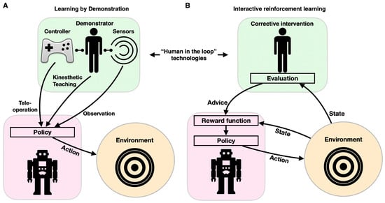 Components of human-in-the-loop technologies: learning by demonstration (A) and interactive reinforcement learning (B). Both paradigms affect the robot’s behavior (purple shape) through its interacting with the environment (orange circles) via feedback from a human (green shape).