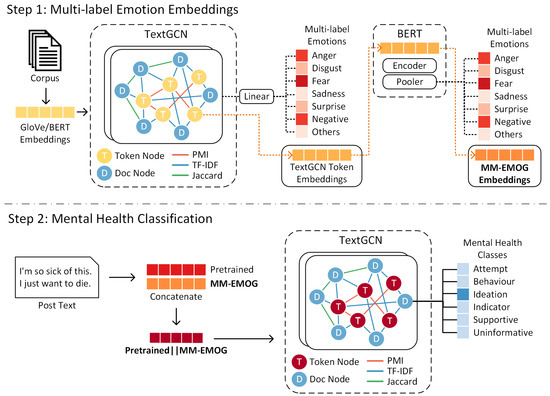 We adapt TextGCN [5] to learn the local and global emotional trend of mental health in social media via a graph-based structure , where V is a set of word and document nodes, E is a set of word–word edges , word–doc edges , and doc–doc edges , and defines the weights of these associations. Figure 1 Step 1 shows the MM-EMOG architecture.