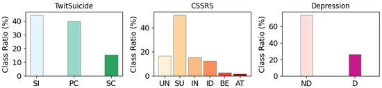 We use three publicly available post-based datasets to evaluate MM-EMOG. Table 1 summarises the statistics, while Figure 2 shows the distribution of classes for each dataset. TwitSuicide (data available upon request ) [38] is a dataset of Twitter posts gathered by searching suicide-related terms and annotated by one psychologist and two computer scientists based on three risk levels outlined by [39]: Strongly Concerning (SC; 15.61%), Possibly Concerning (PC; 40.00%), and Safe to Ignore (SI; 44.39%). The Reddit C-SSRS Dataset (CSSRS) (https://github.com/AmanuelF/Suicide-Risk-Assessment-using-Reddit (accessed on 17 March 2024)) [22] is acquired from 15 mental-health-related subreddits annotated by four clinical psychiatrists based on the Columbia-Suicide Severity Rating Scale [40]. We use the post-level annotations with six classes: Actual Attempt (AT; 1.83%), Suicidal Behavior (BE; 2.87%), Suicidal Ideation (ID; 12.57%), Suicidal Indicator (IN; 15.67%), Supportive (SU; 50.45%), and Uninformative (UN; 16.60%). We note that the dataset contains medical entity normalised posts as detailed in the original authors’ paper. The Twitter Depression Dataset (Depression) (https://github.com/swcwang/depression-detection (accessed on 17 March 2024)) is used as a basis for the practice dataset for CLPsych 2021 [41]. Tweets are collected using depression-related hashtags, stripped off of hashtags, and annotated using binary classes Depression (D; 26.34%) and Non-Depression (ND; 73.66%).