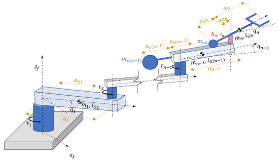 Such requirements remain valid for the last j links (i.e., ), where is the number of passive joints. As a result, the center of mass of the last j links lies on the -th joint axis, and the final j links are considered “fully balanced”.