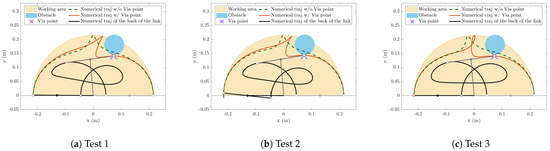 Figure 2, Figure 3 and Figure 4 show the simulated trajectory with one obstacle. The obstacle is a cylinder of radius 35 mm; the center of the base of the cylinder is placed at the point with coordinates mm in the base reference system. For completeness, in Figure 2 and Figure 4, the trajectories without via points and with the same final configuration and are shown. It is clear how the robot, without a via point, is not able to avoid the collision with the obstacle. The Cartesian trajectories of the end effector (Figure 2) are similar, although Test 3 (Figure 2c) shows an entangled path in the middle of the trajectory. The flat variables (Figure 3) are very similar in magnitude; this result is expected since the Cartesian trajectories are similar and the Cartesian trajectory is the result of the joint trajectories, which, in turn, are the result of the flat variables. For the flat variable derivatives, Figure 3 shows the continuity of the derivatives up to the fourth order. Moreover, the regularity of the fourth derivative of the flat variable in Test 3 confirms the continuity of the fifth derivative. The same behavior cannot be found for Tests 1 and 2.