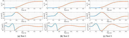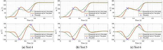 Tests 1 and 3 show no oscillations of the end effector around the final point of the trajectory (Figure 4a,c). This is an expected result since the model used for trajectory planning is the same one adopted for simulation. Conversely, the dynamic model of Test 2 is different from the one assumed in the planning phase. The result is that the robot mathematically does not exactly pass on the via point since all conditions of Section 3.2 are not met. This phenomenon is not highlighted in Figure 2b since the difference is very small; however, this difference may increase for different values of the via points and . Finally, a wide natural oscillation of can be found after the end of the trajectory (Figure 4b).