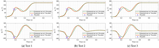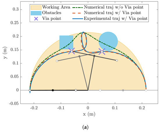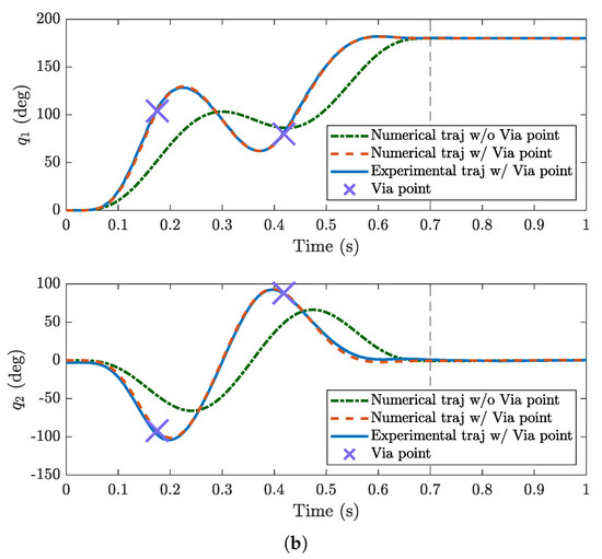 The motion parameters are listed in Table 3, considering that the initial joint values are zero for both joints. It is worth noting that for an underactuated system, the trajectory depends on robot dynamics, which is influenced by the total motion duration () and the real time when the robot passes through the via point (). At the moment, this is a limitation of the proposed trajectory planning and will be studied in future works.
