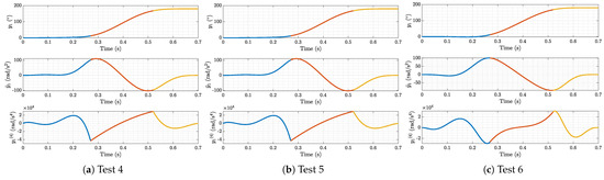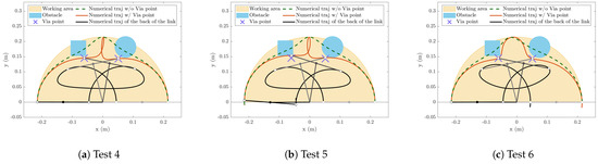 At the Cartesian trajectories (Figure 5), two results can be note. Firstly, the trajectory shapes are rather different between Tests 4, 5, and 6; this is due to the fast movements, which results in different shapes of the polynomials. In particular, the trajectory of the damped robot (Figure 5c) does not present the entanglement of Tests 4 and 5. Secondly, the trajectory of Test 5 collides with both obstacles, although the trajectory of Test 4 does not; this aspect may be crucial in very tight environments.