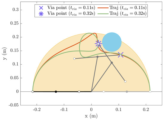 Two different trajectories with two different via points but the same obstacle within the workspace.