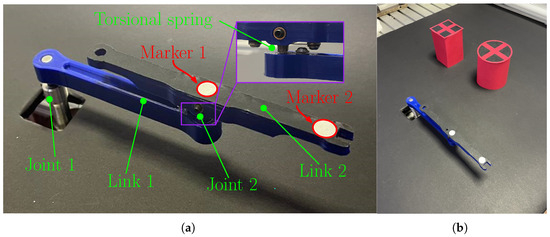 (a) Prototype of the two-DOF robot used for the experimental validation. (b) The two obstacles positioned in the working area.