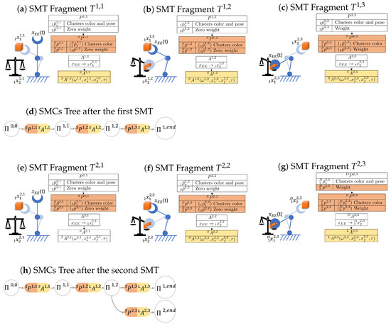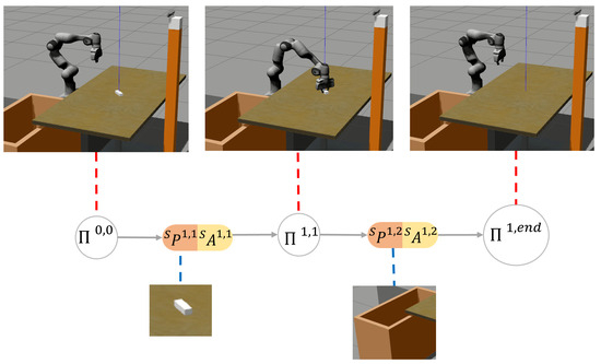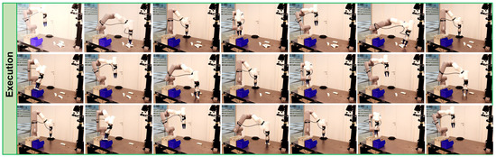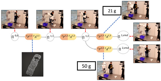 After extracting the SMCs, the robot learned the tree structure depicted in Figure 14. As a result, it can autonomously manage the grasping and positioning of various objects placed in different initial positions. Additionally, it can autonomously identify the contingent SMC to execute based on the object’s weight, as demonstrated in the execution phase shown in Figure 15.