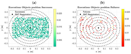 The validation in a pick-and-place simulation scenario demonstrated the robustness and repeatability of the framework, achieving a success rate of over 90%. Examining Figure 11, we observe a decreasing success rate as the object’s location moves further away from the SMT registration point. This decrease is attributed to the increased pose error estimation as objects are positioned near the camera’s field of view boundary. Additionally, from Figure 12a, we notice an increase in time for the vision system to recognize objects located farther away.