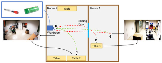 Real Experiments Environment Scheme: In the first SMT registration, the robot traveled the green route: starting from point A, it opened a sliding door, took an object from the wardrobe in B, and placed it on a table at the final point C. Instead, in the second registration, it traveled the red path by opening the same sliding door, taking a different object in the wardrobe in B, and placing it on a table at the final point D.