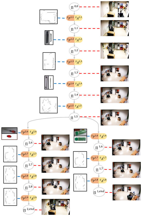 Following the extraction of SMCs, the robot acquired the knowledge represented by the tree in Figure 18. As a result, it possessed the capability to independently handle the grasping and placement of various objects, even when they were initially positioned differently. Additionally, the robot autonomously identified the contingent SMC to execute based on the type of object involved.