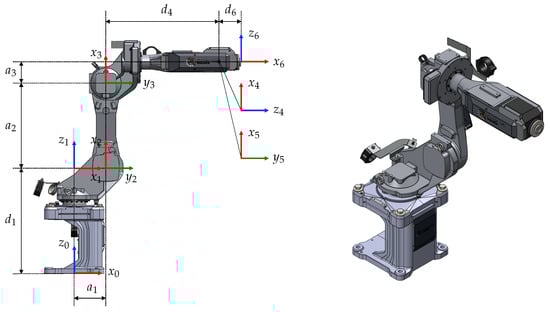 From a multibody point of view, a 6 DOF anthropomorphic robot is composed of a base and six bodies (typically referred to as links), each interconnected through a revolute joint. Kinematic modeling in robotics is usually carried out following the Denavit Hartenberg (DH) convention [34], which affixes frames to the various parts of the manipulator and then describes the relationships between these frames. The 6 DOF anthropomorphic robot with attached DH frames according to the convention described in [31] is reported in Figure 1, while the DH parameters are presented in Table 1.