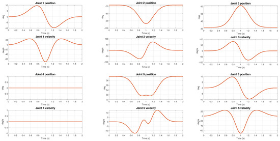The Simulink scheme of the computed torque algorithm implemented is shown on the left in Figure 15 and Figure 16. More in detail, we specified a sinusoidal trajectory for each joint as in Equation (23), where for each joint, s, s and:
