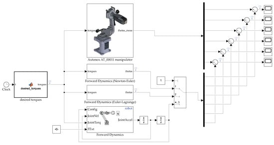 Simulink scheme of the forward dynamics of the manipulator using the Simscape Multibody model, the Newton-Euler model, the Euler-Lagrange model and the Robotics System Toolbox block.