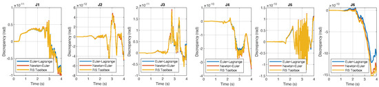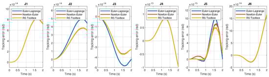 where is the initial joint displacement, is the required joint displacement, is the initial time and T is the total time of motion. The initial time is set as , the total time of motion is set as , the initial joint displacement is set as for each joint while the required joint displacement for each joint is set as . The resulting trajectory error is shown in Figure 11: the tracking error is on the order of and, in the three considered cases, is closely matched. The average elapsed time of the simulations using the three different algorithms for the computation of inverse dynamics is reported in Table 4: the simulations showed, in fact, that the Newton-Euler inverse dynamics is computationally more efficient, while, on the other hand, the use of inverse dynamics block of the Robotic System Toolbox requires a longer simulation time.