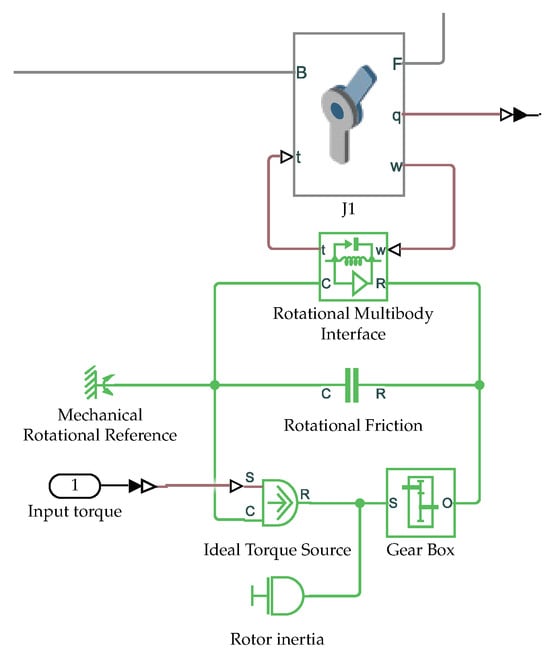 Torque-controlled Simscape multibody revolute joint with rotational friction, reduction gear and rotor inertia.