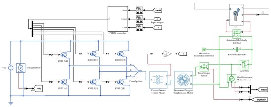 In our Simscape model, we modeled each joint as in Figure 14 and the input torque of the PMSMs controller is the commanded torque of the manipulator’s control algorithm. It is worth mentioning that if we want to fully take into account the actuators dynamics in the Simscape model, the Simulink solver configuration should be adjusted according to the PWM switching frequency and motor control sample time.