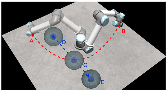 The objective function serves to achieve motion planning with the UR5 arm manipulator while avoiding collision during the trajectory. The safety aspect that is emphasized in this paper is robotic motion without collision. This is attainable by including obstacle coordinates relative to each nonstationary link position of the arm manipulator within the agent’s state space. Note that low-level trajectory control is not part of this scope. When used in real robot scenarios, a control trajectory system handles the low-level control to alleviate the concerns about forbidden positions and avoid links colliding with each other. Therefore, without the need for such concerns, the initial step in testing the feasibility of the algorithm was to simulate the UR5 in a MuJoCo [40] environment. MuJoCo is a high-performance physics engine designed for model-based control within robotics. The MuJoCo engine accurately simulates complex physical interactions involving multiple joints and contact points. This makes it an ideal platform to test and refine rigorously designed algorithms for robotic manipulation.