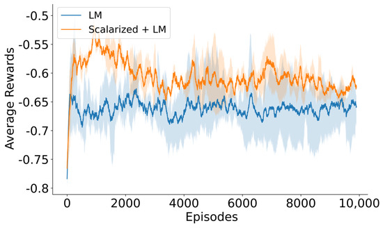 Averagereward progress over episodes. The blue curve represents the LM method alone, and the orange curve is the proposed scalarized + LM method.