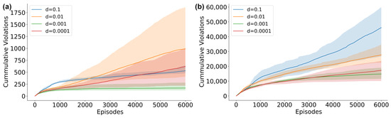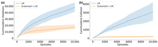 The cost limit, d, plays an important role in reducing violations and collisions when using the scalarized expected return with the LM approach. Figure 5 shows the effect, highlighting the relationship between d and the number of violations and collisions. A smaller value of d corresponds to fewer cumulative violations and collisions. This effect occurs because, as d decreases, the allowable cost decreases. Setting the cost limit should theoretically reduce the violations to zero, at which point the reward function can be ignored.