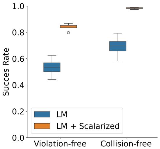 Figure 4 provides an analysis of the different success rates. In concrete terms, collision-free corresponds to a successful trajectory where none of the robot’s links collide with the object but may enter the violation region, hence . Violation-free corresponds to a successful trajectory without considering whether a violation occurred or a collision. The method achieves rates of 84% and 98% for violation-free and collision-free, respectively.