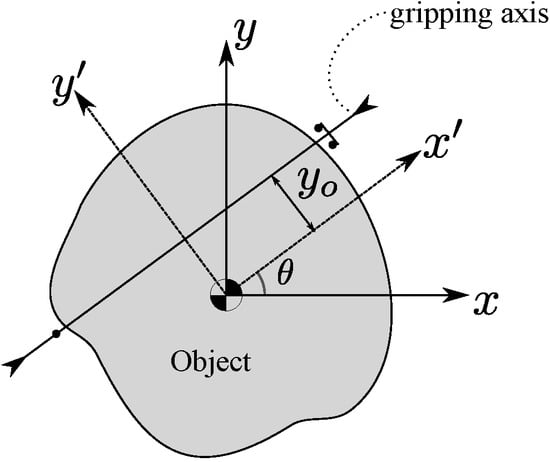 The gripper considered in this work is a parallel-jaw gripper (Figure 2). We define the grasp by a pose of the gripper relative to the object. The grasp is denoted by and is the tuple (Figure 3). The grasp specifies the 2D position and orientation of the object relative to the object reference frame. The gripping axis (line along which the fingers move) is the x-axis of the frame, obtained by rotating the gripper reference frame (initially aligned with the object reference frame) about the z-axis by an angle and then translating it by a distance along the rotated y-axis (Figure 3). The object reference frame has its origin at the center of mass of the object, and its orientation is determined at the stage when the object CAD is created. Based on the grasp parameterization we used, we consider top grasps on the object. Also, we search grasps at a fixed depth below the top surface of the object. This choice was motivated by the consideration that many industrial parts have a distinct top surface and gripping can be performed on the side surfaces.
