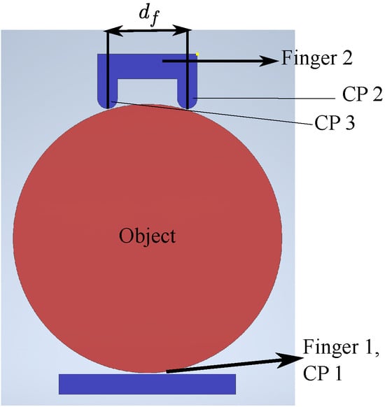 The finger shape is determined by the three-contact gripping scenario considered in this work. As shown in Figure 4, the two fingers interact with the object at the three contact points (CPs). Finger 1 has one contact point (CP1) and Finger 2 has two contact points (CP2 and CP3). The distance between the contact points () is the finger design parameter. The information of the contact locations on the finger and the grasp pose is used to extract the contact locations on the object that will interact with the gripper. The information of the contact locations on the object is used to determine the quality of the grasp.