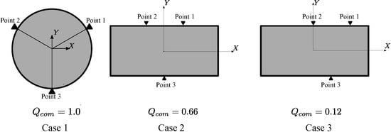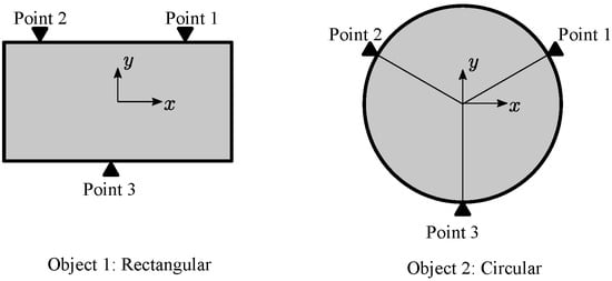 To illustrate how the grasp quality measure behaves, we give the value of grasp quality for two examples. Figure 5 shows the examples. For the rectangular object, we obtain a grasp quality of , and for the symmetrical placement of gripping locations on the circular object, we obtain a quality measure (Table 1). Therefore, we can say that the grasp on the circular object is better in terms of force distribution.