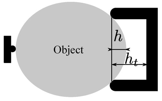The usual workflow for automated design of finger shape [] starts with a CAD model of a product or a set of products that should be grasped by the multi-function finger []. The first task is to find the optimal gripping locations on the object for an optimality criteria taken from the field of optimal grasping [,,,]. Once optimal gripping locations on the object have been determined, we can generate the shape of the finger. In the case of three-contact grasping, a generic curved finger shape is chosen. Further steps include collision checking and the design of the finger body to be attached to the gripper. Design time is an important criterion for flexible gripping applications. Usual methods to speed up the process are to use sampling-based optimization methods [] and computationally inexpensive optimality criteria []. The final step is experimental verification of the finger shapes []—testing the ability of the fingers to resist external forces on the grasped object.