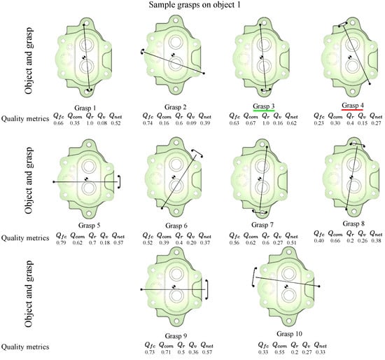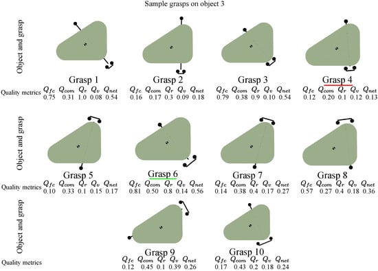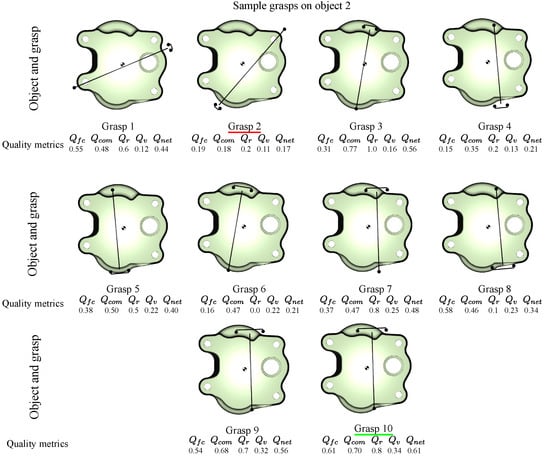 The results of the comparison are presented in Table 13. We consider the three objects from the previous analysis. Table 13 lists the best three grasps for each object based on our method and the method in []. The grasp quality measure in our method is the net quality obtained from the four grasp quality measures, whereas [] uses the epsilon quality measure.